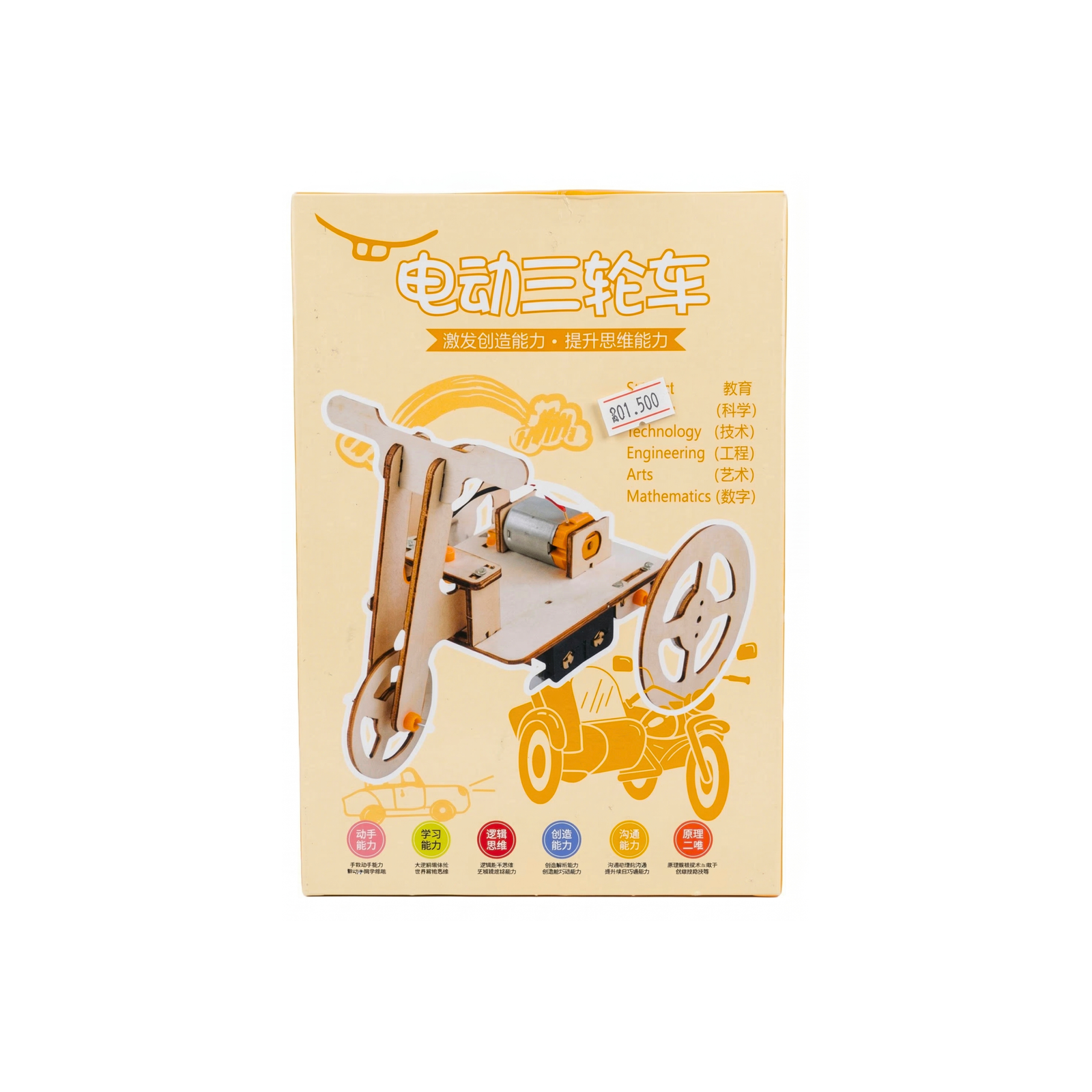 نموذج خشبي للدراجة النارية ثلاثية العجلات يتم تركيبه وتوصيله بمحرك ليعمل بالبطارية.