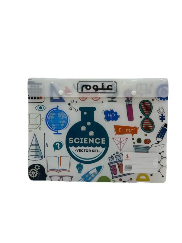 نظم أوراقك ودفاترك بأسلوب علمي مميز مع حافظة الأوراق البلاستيكية المصممة خصيصًا لمادة العلوم ! تأتي الحافظة برسومات تعليمية جذابة مثل أنابيب الاختبار، الذرات، الحمض النووي، والمعادلات، مما يجعلها الخيار الأمثل للطلاب والمعلمين.