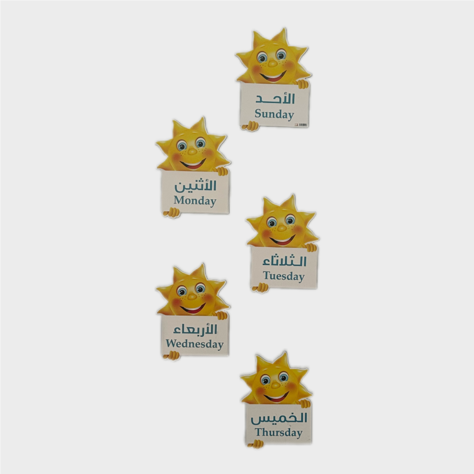 مجموعة بطاقات تعليمية مزينة بشخصيات مرحة (الشمس المبتسمة) توضح أيام الأسبوع باللغتين العربية والإنجليزية.